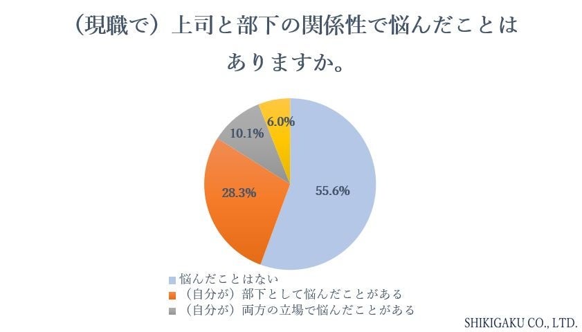本項目では「悩んだことが無い」が全体の55.6%を占めている一方で、上司・部下いずれかとして悩みを持っているといった回答も44.4%となっており、約半数の方が何かしらの悩みを上司部下の関係性で持っているという結果が出ました。