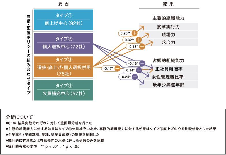 第1に、個人選択型HRMは、上司や人事による明確な個人尊重のポリシーのもとで機能するということです。それは、無責任や放任主義とは異なり、個人の選択や生き方を尊重し人を生かそうとするものでなければなりません。そのことが、例えば、異動・配置において、個人選択型と選抜型・底上げ型の組み合わせが、現場力を強くしていたことに表れています。
