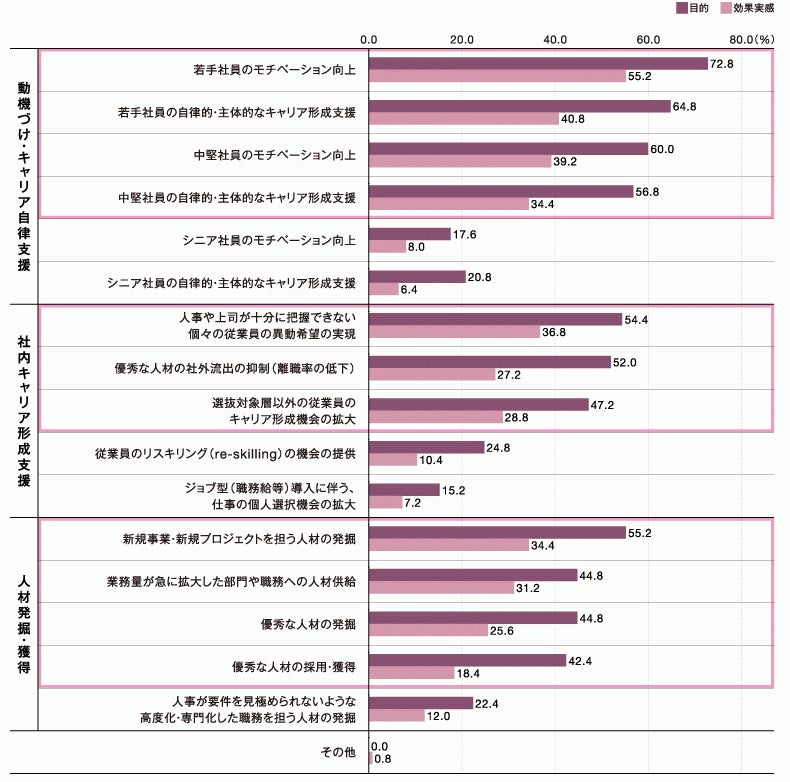 ・社内公募制度導入の目的と効果実感の両方が高いのは、「若手社員のモチベーション向上」(目的72.8%・効果実感55.2%)、「若手社員の自律的・主体的なキャリア形成支援」(同64.8%・40.8%)、「中堅社員のモチベーション向上」(同60.0%・39.2%)、「中堅社員の自律的・主体的なキャリア形成支援」(同56.8%・34.4%)、「新規事業・新規プロジェクトを担う人材の発掘」(同55.2%・34.4%)