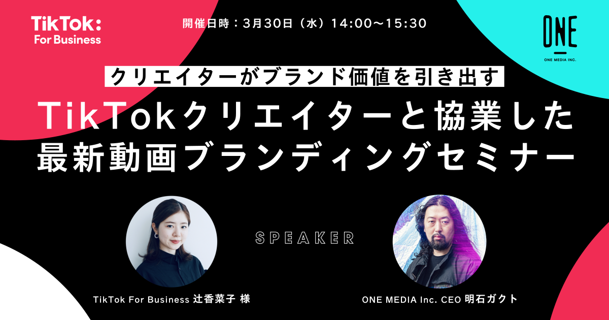 ワンメディア株式会社(東京都目黒区、代表取締役:明石ガクト 以下、ワンメディア)は、TikTok For Business Japan(東京都新宿区、代表取締役社長:佐藤陽一)と共同で、 無料オンラインセミナー『〜クリエイターがブランド価値を引き出す〜 TikTokクリエイターと協業した最新動画ブランディングセミナー』を3月30日(水)14時より開催いたします。なお、本セミナーは50社限定で実施、応募期間は3月17日(木)〜3月29日(火)13時までとなります。