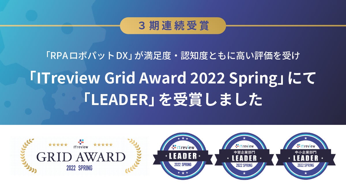 【3期連続受賞】「RPAロボパットDX」が満足度・認知度ともに高い評価を受け「ITreview Grid Award 2022 Spring」にて「LEADER」を受賞しました