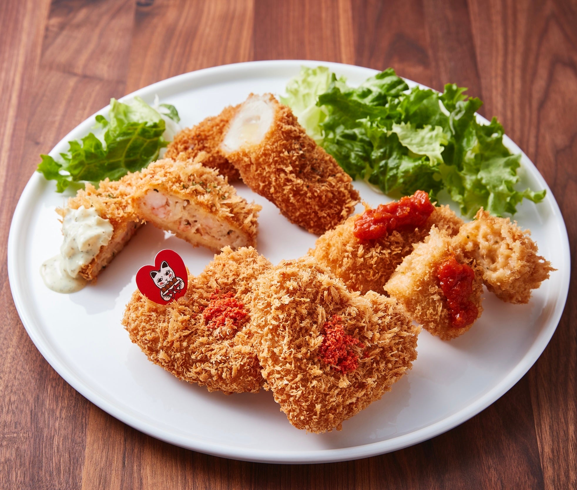 【内容】明太ポテトのハートコロッケ×2、境港水揚げ紅ずわい蟹のクリームコロッケ(味わいトマトソース 付き)×2、とろーりチーズのチキンカツ×1、海老と帆立のカツ(マイルドタルタルソース 付き)×1