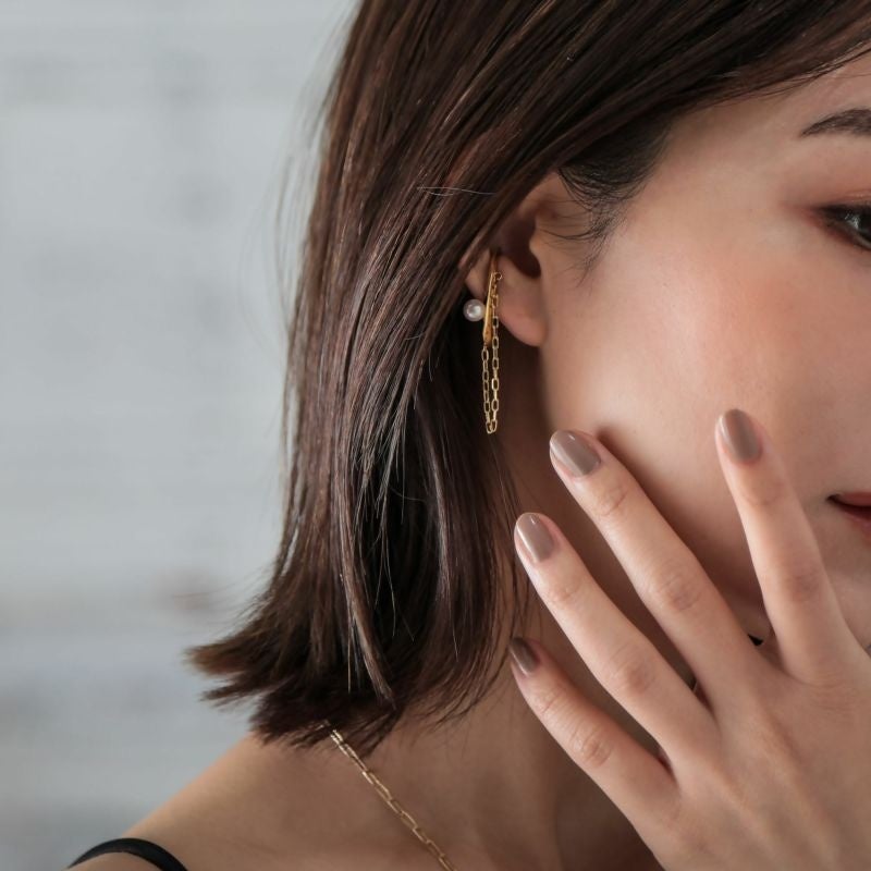 しなやかに揺れるチェーンとさりげないベビーパールがアクセントのイヤーカフ。