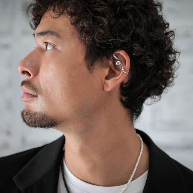 耳上部の外耳輪に沿った軟骨にはめこむだけなので、耳の形や厚みを問わず楽に着脱できるデザイン。