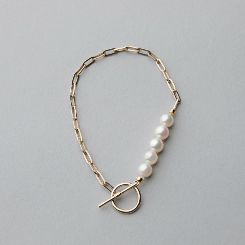 ゴールドの輝きが美しいペーパークリップチェーンは、K10素材を贅沢に使用。艶めくあこやホワイトパールをアクセント的に配置。手元を洗練された印象に演出。