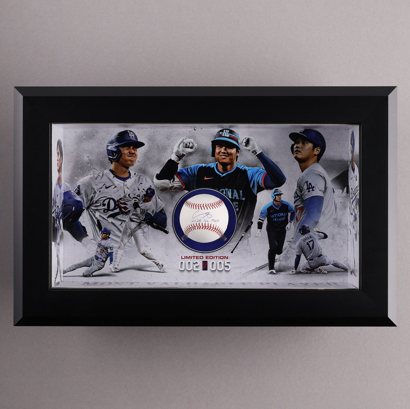 説明|大谷選手のMVPシーズンを記念した限定版シャドーボックスです。大谷選手の輝かしい姿を収めた画像と、「2024 NL MVP」の刻印が中央に入ったローリングス社製MLB公式ボールに彼の象徴的なサインが施されています。