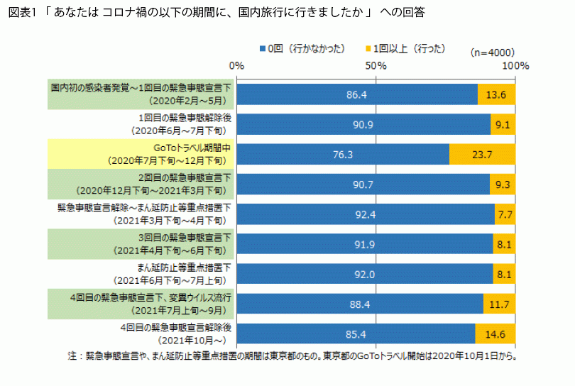 「Go Toトラベル期間中」をみると、旅行に行った人は23.7%とコロナ流行以降で最高に。今回の調査でコロナ前に「年1回以上旅行に行く」人61.2%(図表非掲出)との差分は37.5ポイントもあることから、Go Toトラベルによる需要喚起効果は限定的であったとも言えそうです。