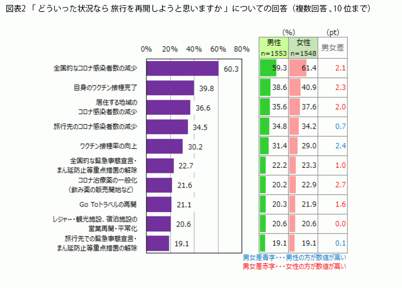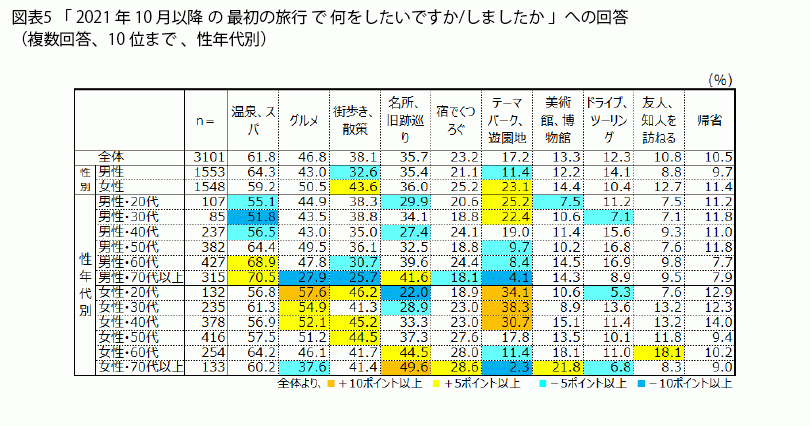 「友人、知人を訪ねる」と「帰省」はともに女性のほうが高値ではあるものの、後者は男女差が比較的拮抗しています。“まずは、しばらく帰れなかった故郷に” “まずは友達に会いに行きたい”と考える人が一定数いることがうかがわれます。