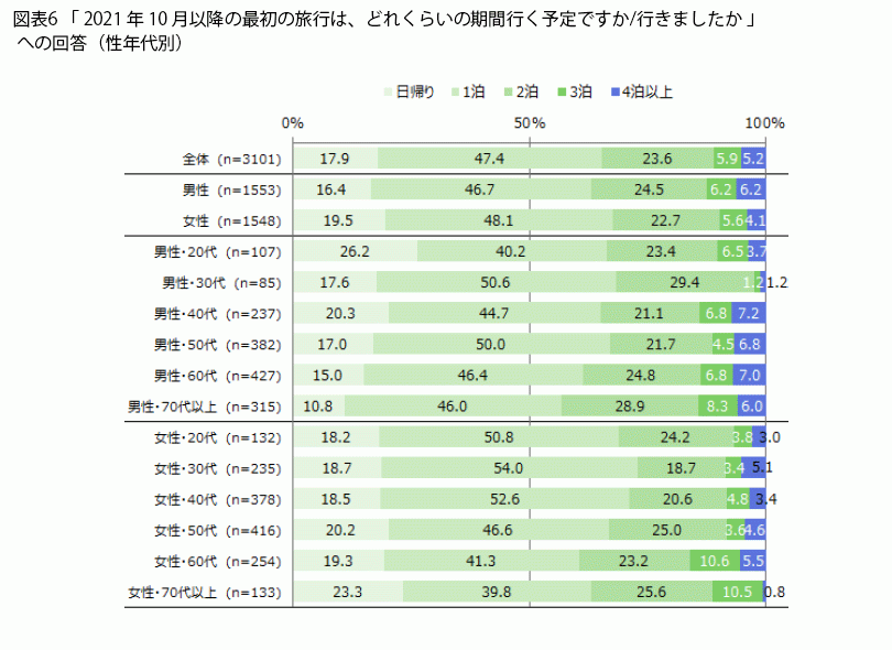 性年代別では、「日帰り」派は男性で20代の26.2%を筆頭に年代が上がるほど低下し、女性は逆に年代とともに上昇する傾向があるのは興味深いところです。また、「3泊以上」(「3泊」+「4泊以上」)のゆったり旅行を志向する人の比率は、男性では30代を除き1割超と安定的ですが、女性は50代以下が6~8%と1割を切っています。女性は“子どもの学校や仕事などを考えると長期の旅行は難しい”などと現実的に考える一方で、男性は “ゆっくり休んでコロナ疲れを癒したい!”という願望も含めての結果かもしれませんね。女性60代が16.1%と全体で最多となっているなど男女ともシニア層では高値になっているのは、定年退職で比較的時間に余裕があることも背景にありそうです。