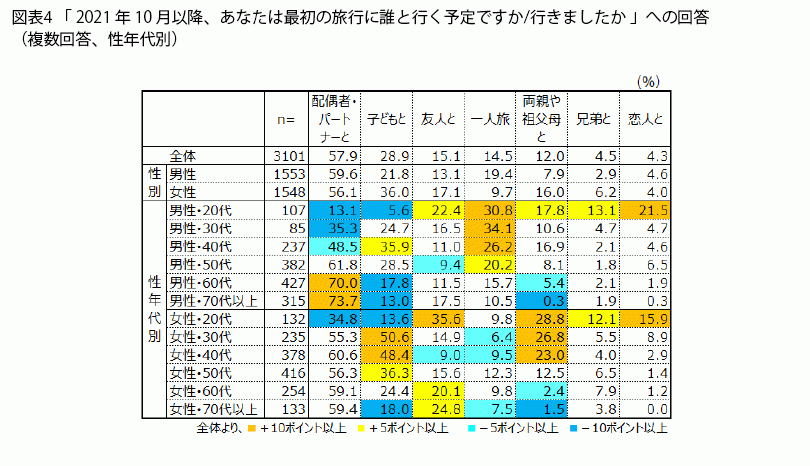 性年代別にみると、男性の若年・壮年層での「一人旅」の高さが目を引きます。特に20・30代では3割を超えており、若年男性は“1人気ままに旅をしたい”ということでしょうか。女性30・40代では「子どもと」が約半数であるほか、「両親や祖父母と」も4分の1前後と、ファミリー優先の旅行を考えている人が多いことがうかがわれます。また若年層では「友人と」と「恋人と」が他年代に比べて高いのは納得できますね。60代以上をみると、男性が「配偶者・バートナーと」が7割超と高値である一方で、女性は6割弱にとどまっているのは興味深いところです。