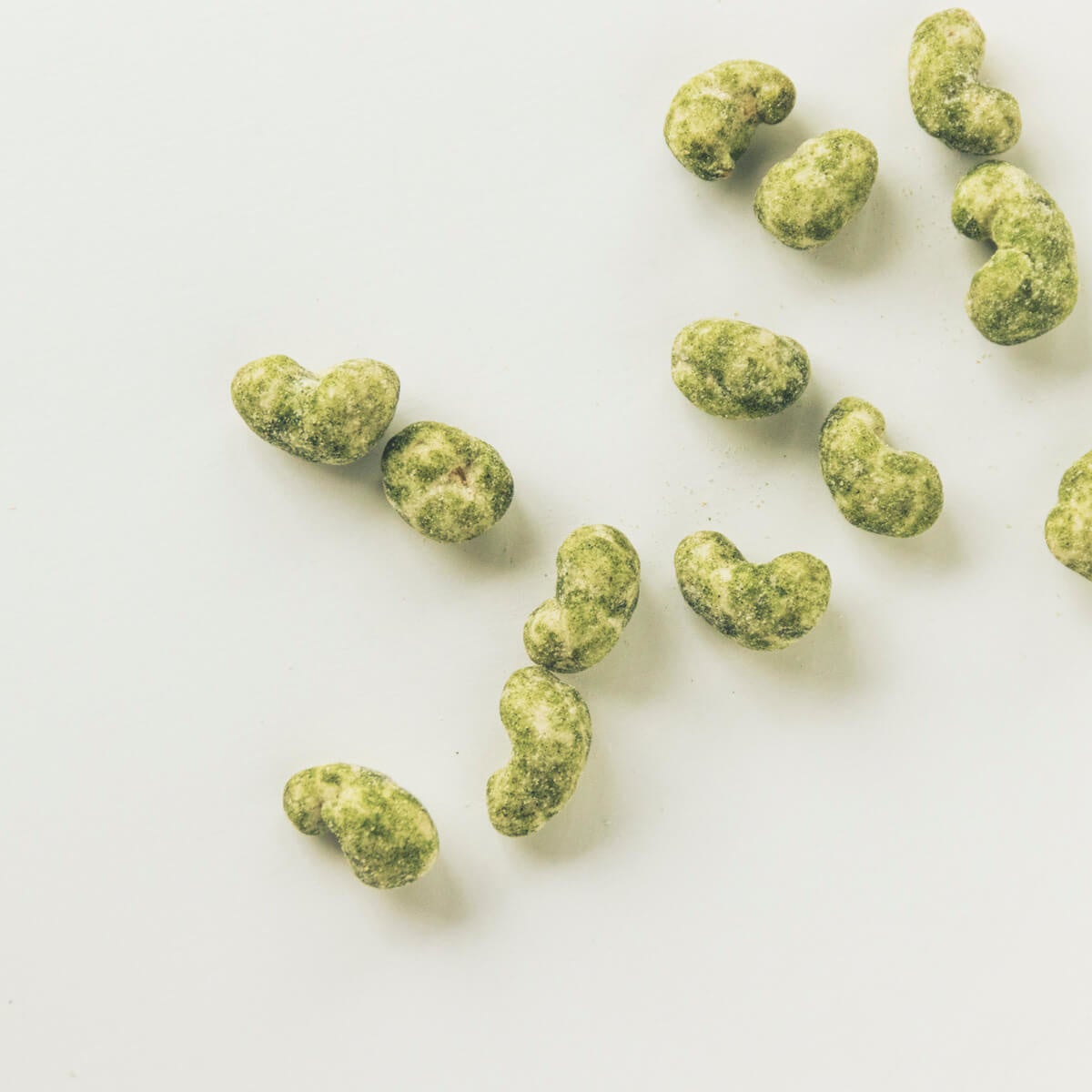 青のりの衣を纏ったカリッとした食感のカシューナッツ。生搾りで香りを抑えて旨みを生かした太白胡麻油と、香りが豊かな愛媛県産青海苔を使用し、ほのかな甘みのある沖縄の海水塩で引き締めました。