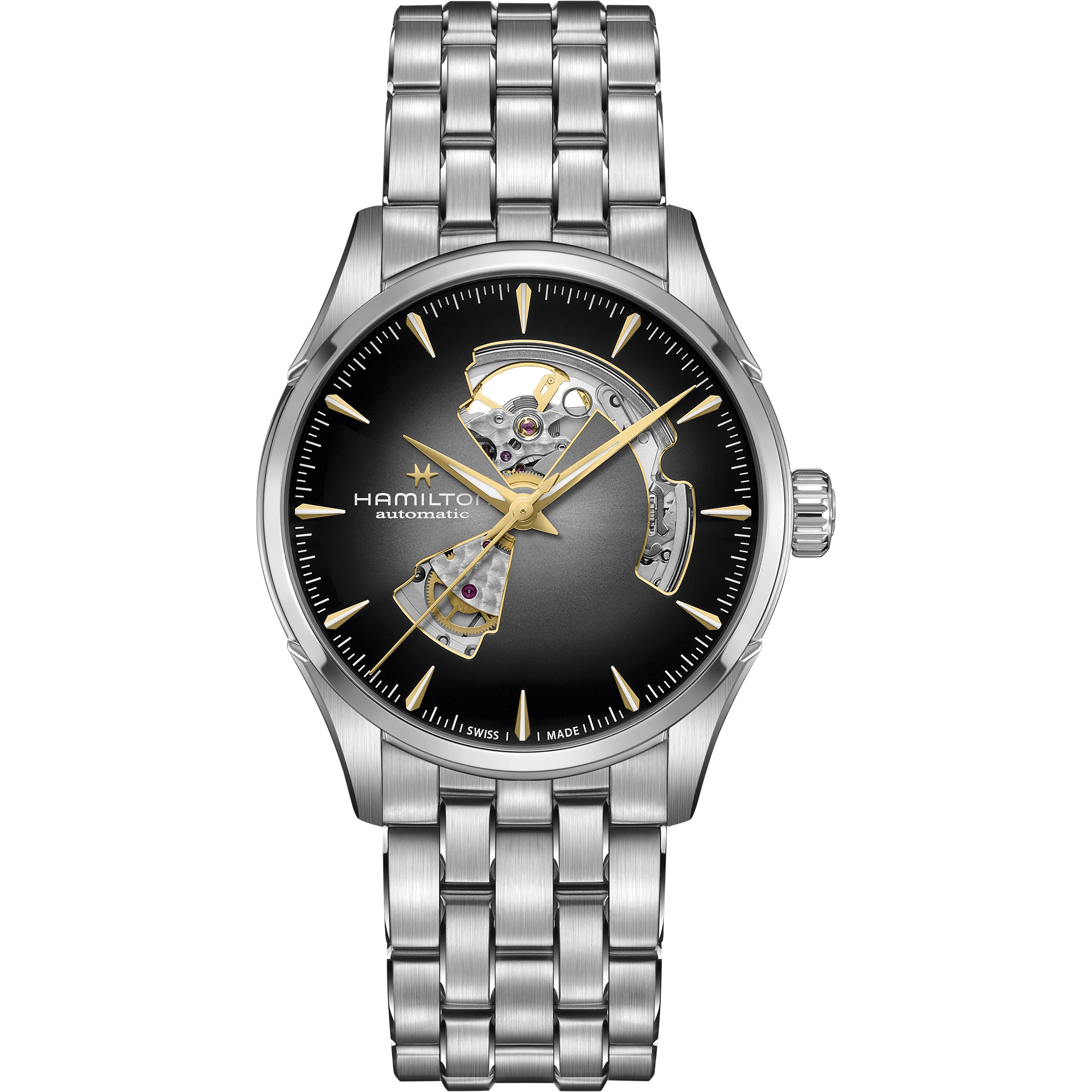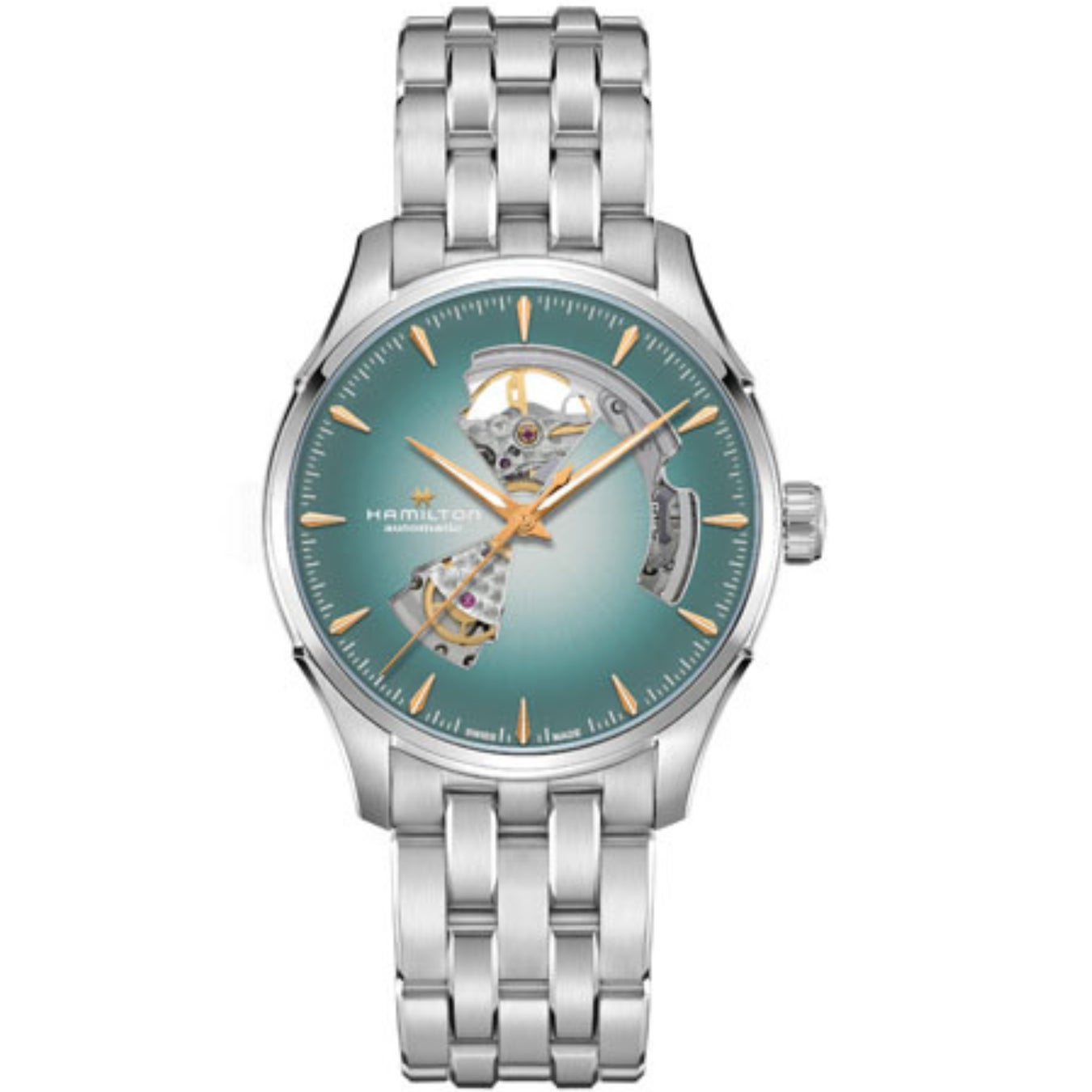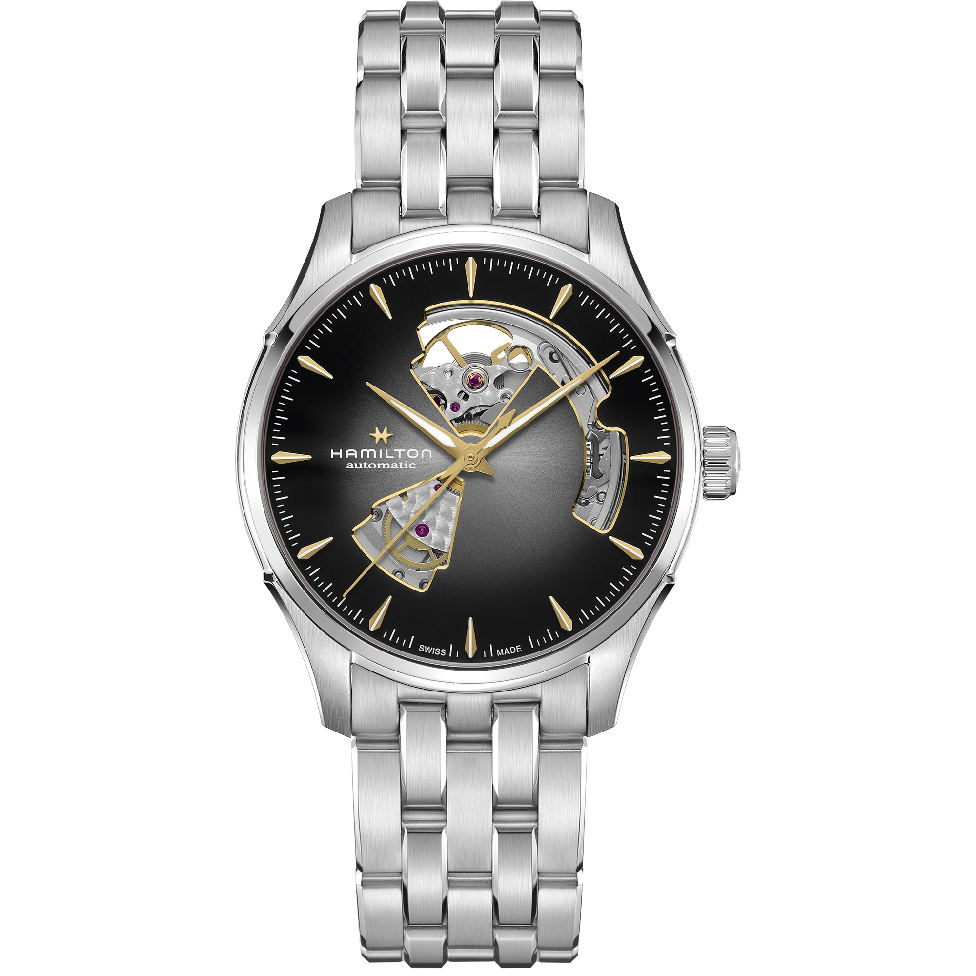 このコレクションには、ハミルトンの自動巻きムーブメントH-10を搭載。80時間の標準持続時間を備え、Nivachron™製ヒゲゼンマイによって信頼性をさらに高めています。反射防止加工を施したサファイアクリスタルと丁寧に仕上げられたケースが、洗練された美しさと機構の持つ魅力を調和させ、タイムピースとして、「ジャズマスター オープン ハート」をより一層引き立てます。