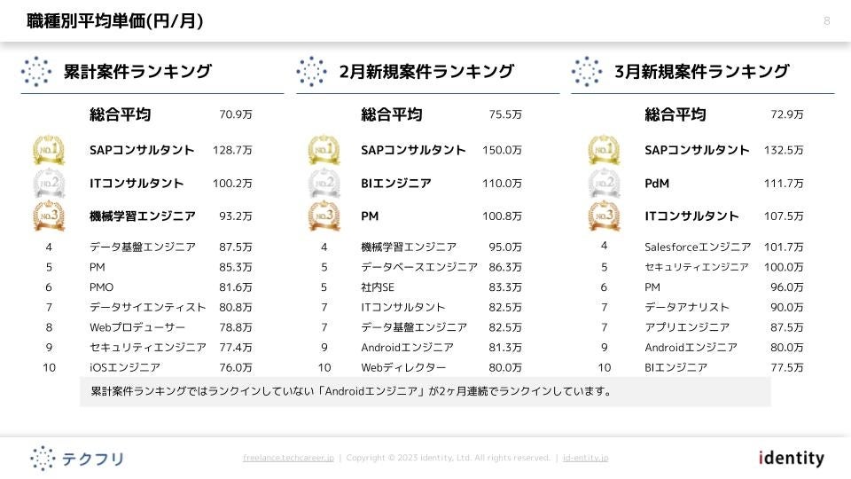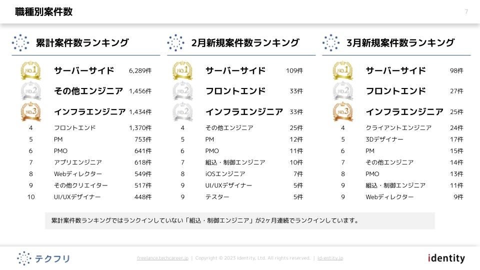 ITフリーランスエンジニアの案件・求人サイト「テクフリ」(https://freelance.techcareer.jp/)を運営する株式会社アイデンティティー(東京都新宿区、代表取締役:今野 力、以下「当社」)は、テクフリのデータベースをもとに2023年3月における案件の市況感を調査しました。より詳しい結果については、お問い合わせから資料請求が可能です。