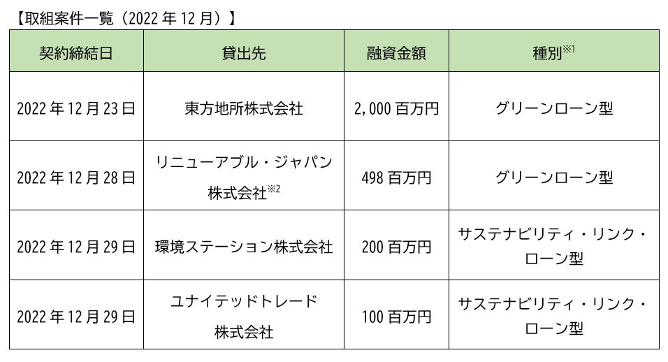 ※1 サステナビリティ・リンク・ローン型における数値目標、グリーンローン型における資金途等詳細については、弊行のホームページをご参照下さい。