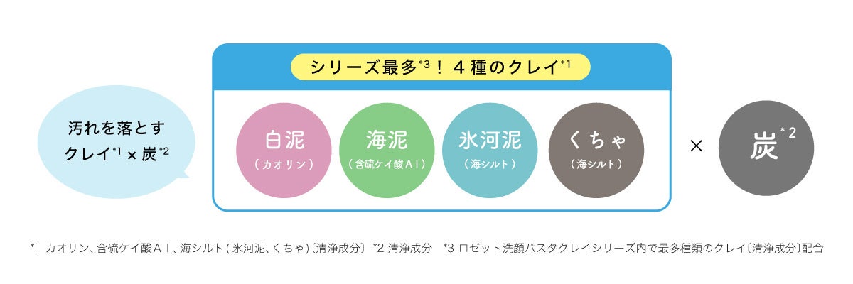 *2 ロゼット洗顔パスタクレイシリーズ内で最多種類のクレイ〔清浄成分〕配合 *3 カオリン、含硫ケイ酸Al、海シルト(氷河泥、くちゃ)〔 清浄成分〕 *4 清浄成分