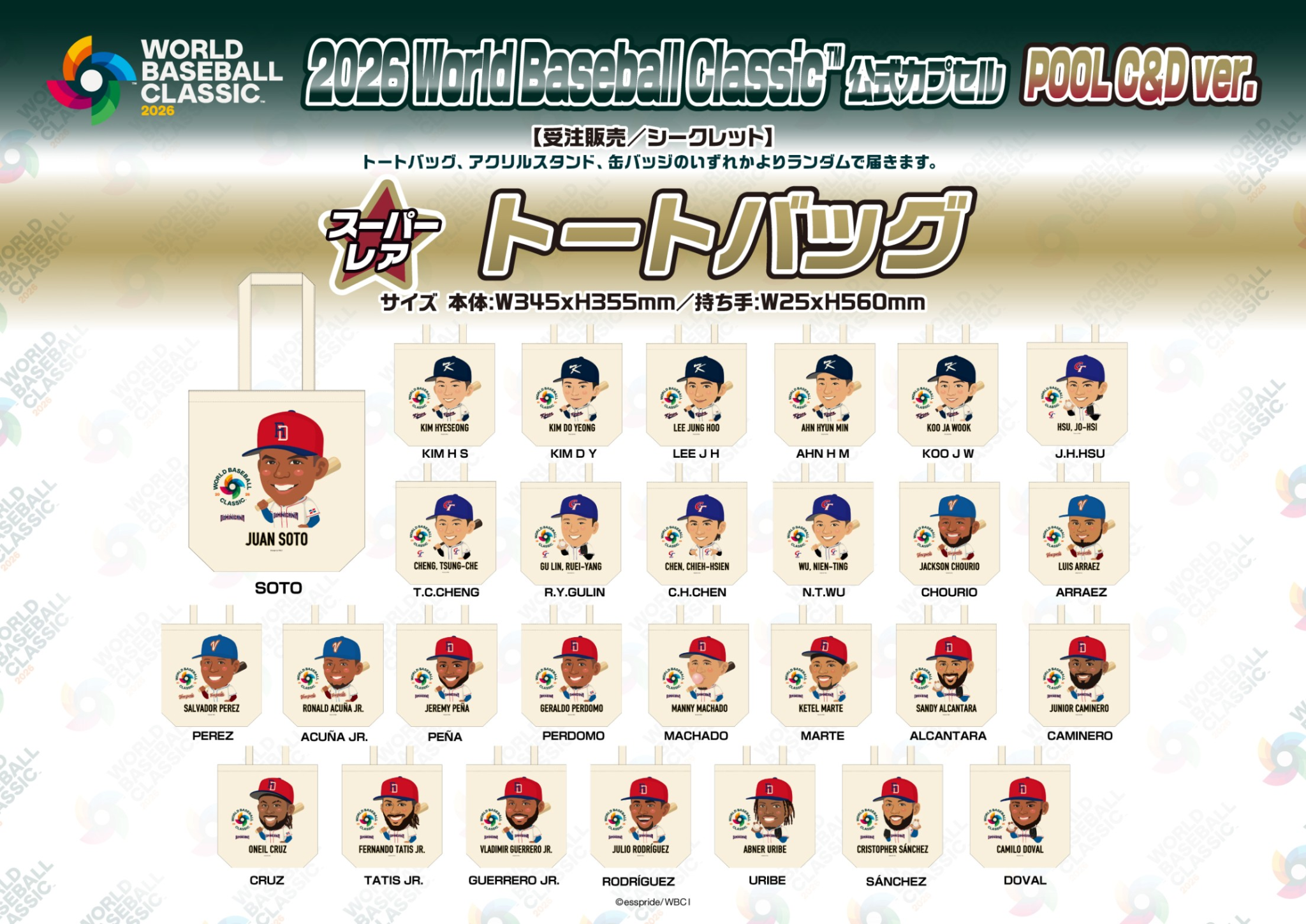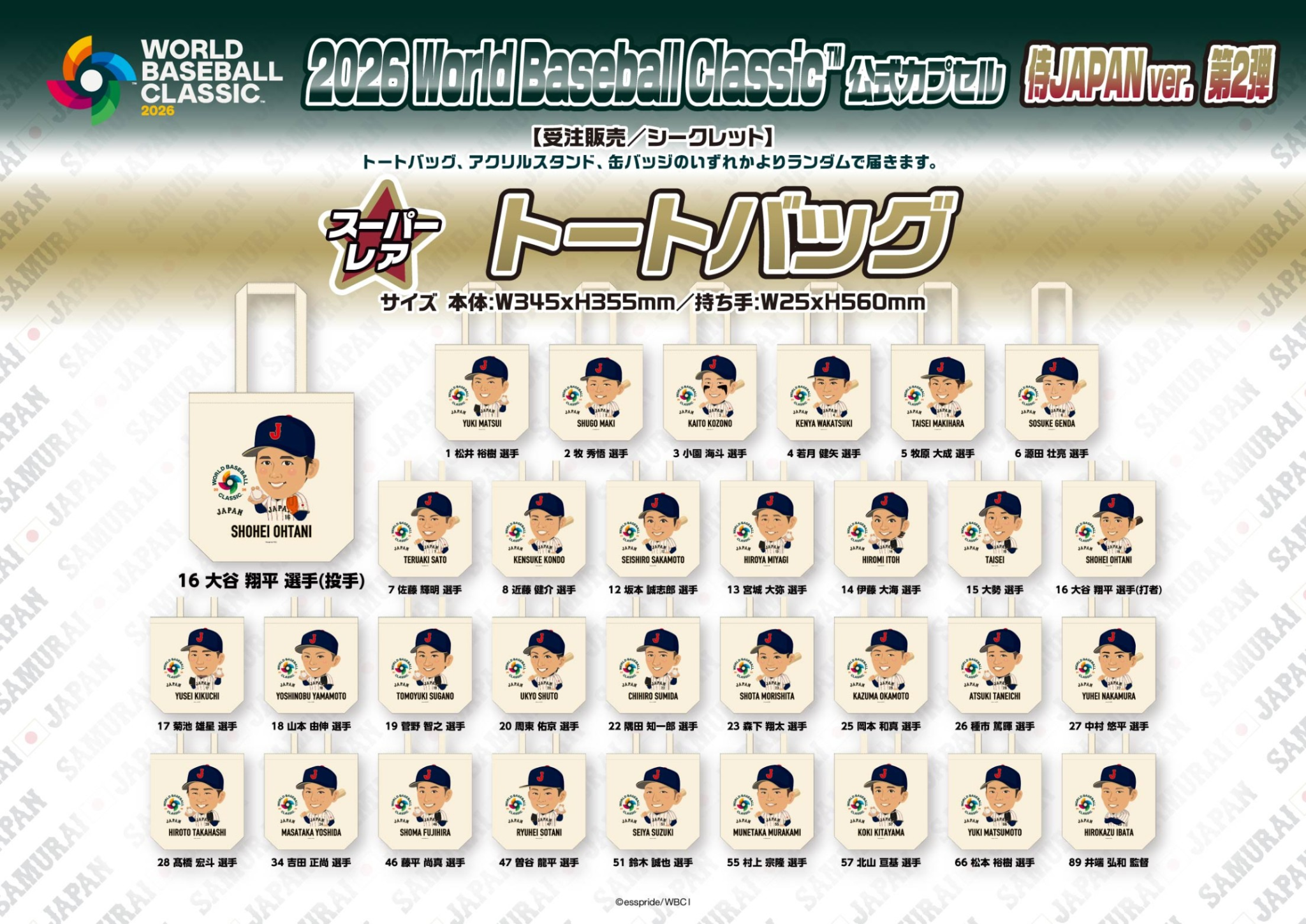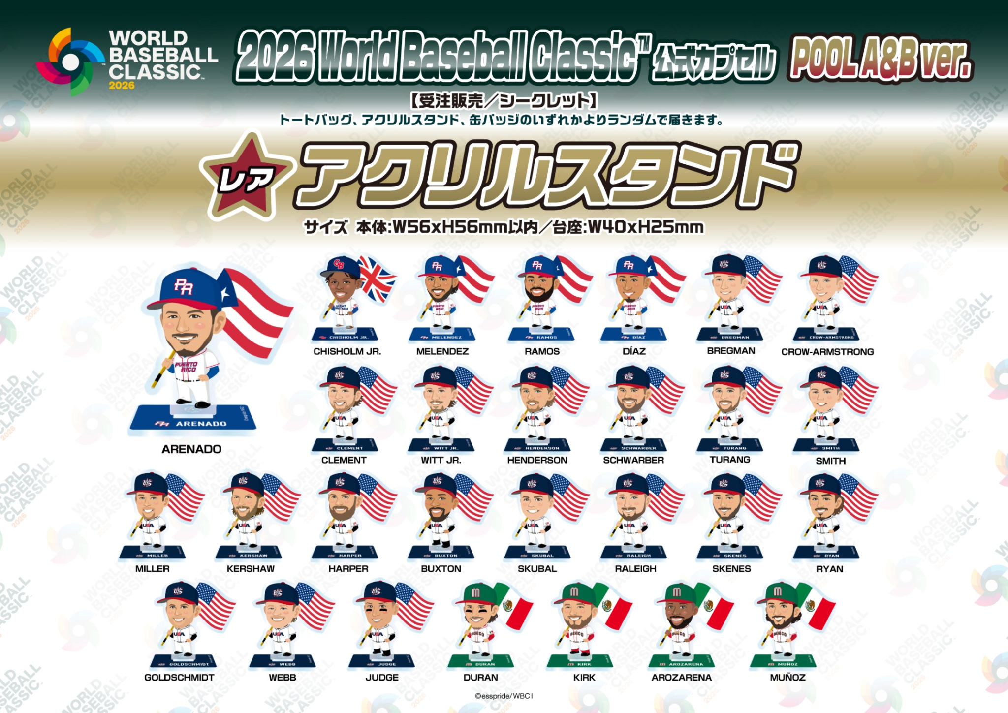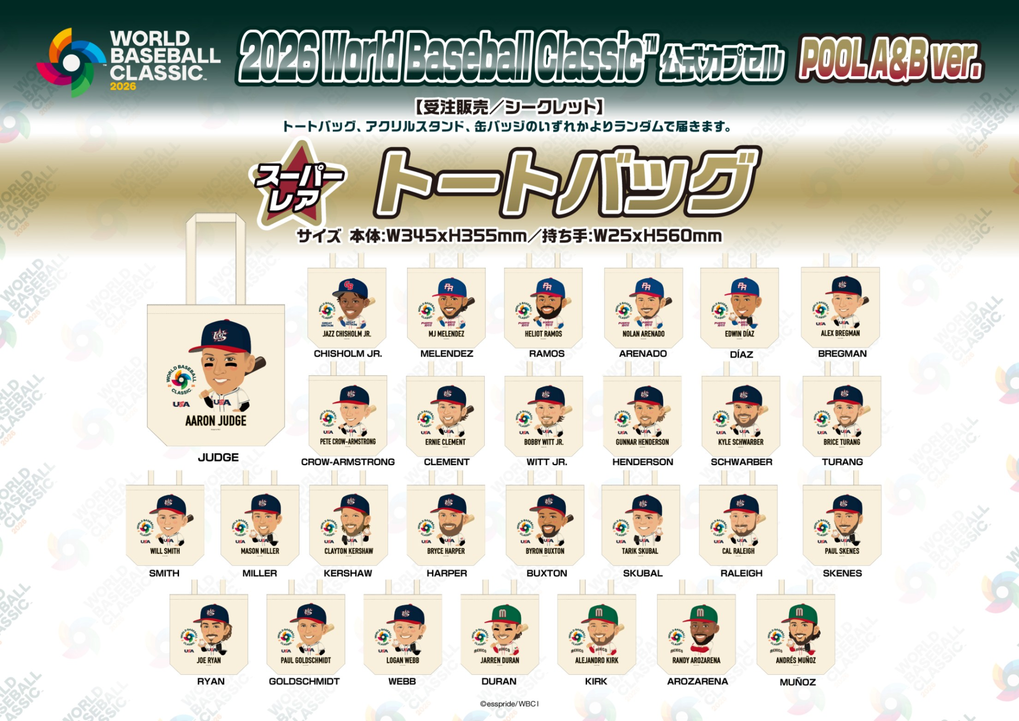プロスポーツチームやアーティストなどの商品プロデュースを行うesspride株式会社(所在地:東京都渋⾕区、代表取締役CEO:⻄川世⼀) は、2026 WORLD BASEBALL CLASSIC™の開催を記念して、2026 World Baseball Classic™公式カプセル POOL A&B ver.、POOL C&D ver.、侍JAPAN ver. 第2弾の発売を2026年2月27日(金)から開始いたします。