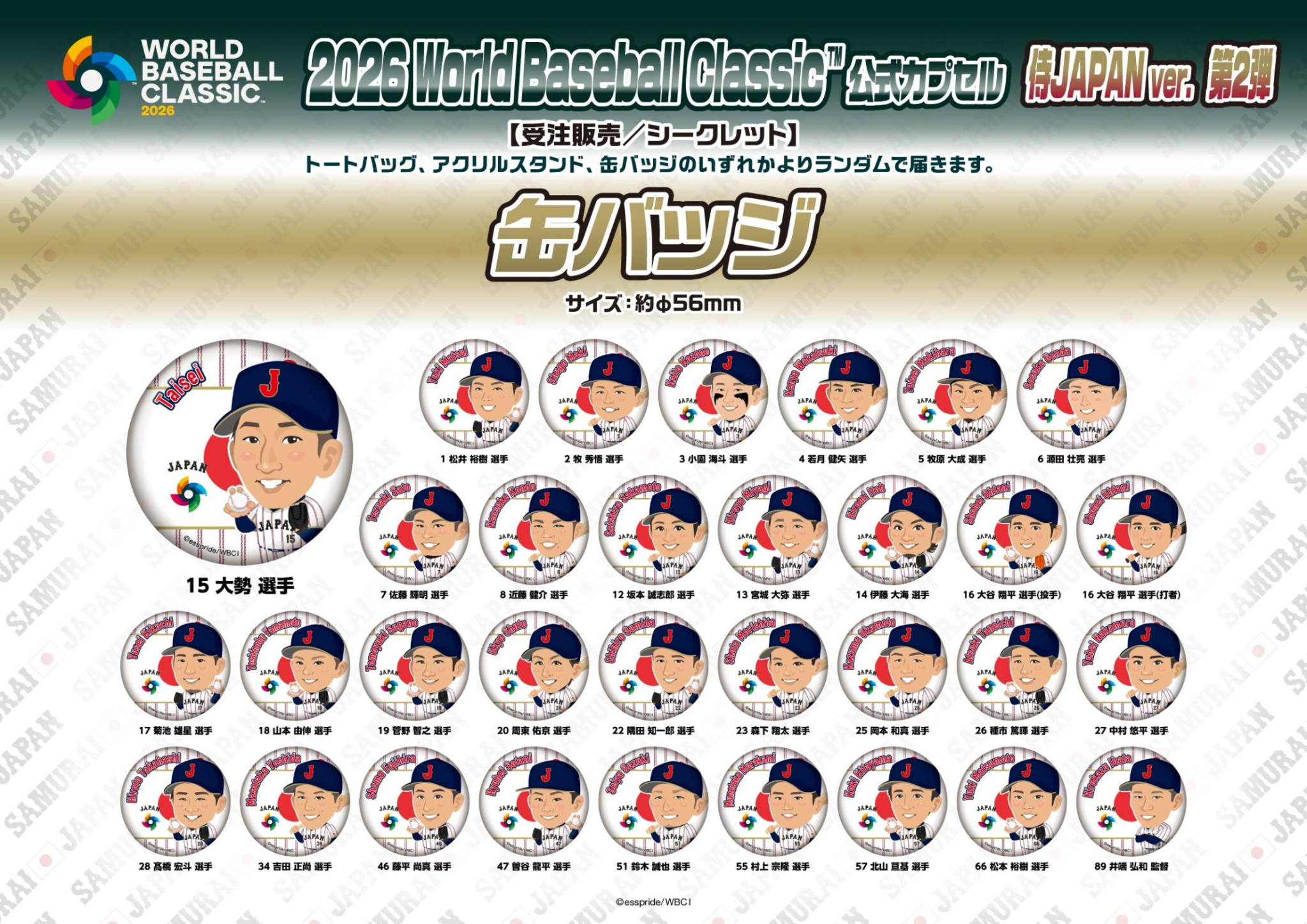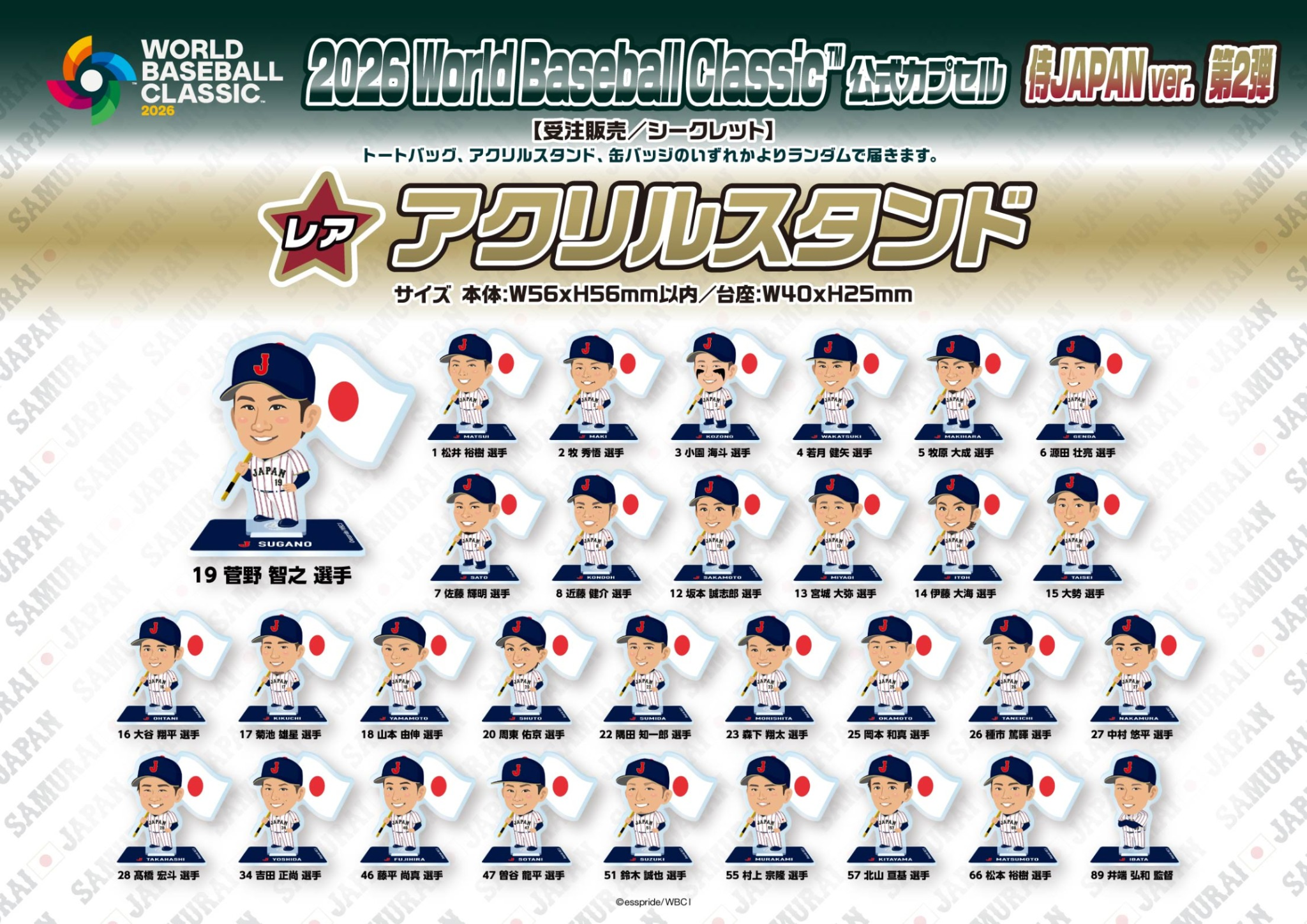 さらに、2月14日(土)に発売された2026 World Baseball Classic™公式カプセル 侍JAPAN ver.の第1弾(https://prtimes.jp/main/html/rd/p/000000116.000032768.html)に続き、新デザインの缶バッジに、レアアイテム「アクリルスタンド」とスーパーレアアイテム「トートバッグ」が新たに追加された第2弾も登場。いずれも、2026 World Baseball Classic™限定の公式カプセルです。