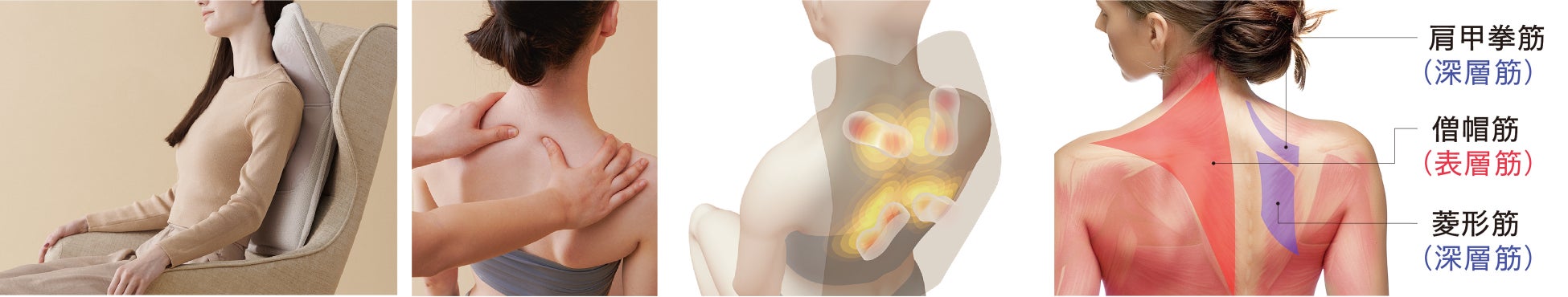 L型のシート形状が、肩上部から肩甲骨を包み込むようにホールド。上のもみ玉が僧帽筋などをググッともみほぐし、下のもみ玉は肩甲骨のまわりを、心地よくなめらかにほぐします。