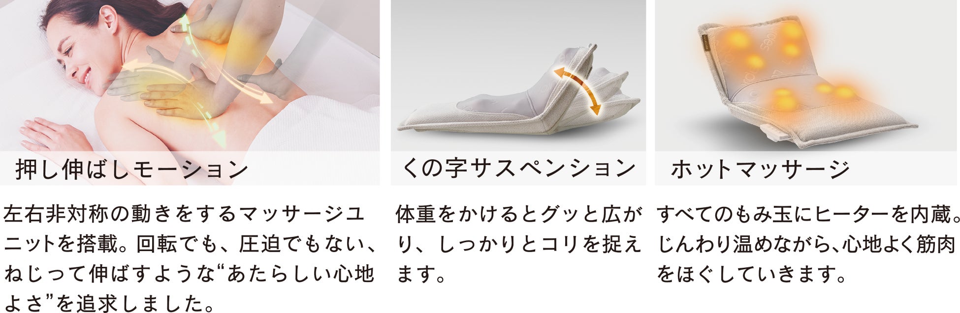 上下のもみ玉が広背筋をとらえ、広範囲をくまなくもみほぐすマッサージを実現しました。寝姿勢でシートに身をゆだねればサスペンションのパワーも加わり、コリをつかむようにマッサージします。