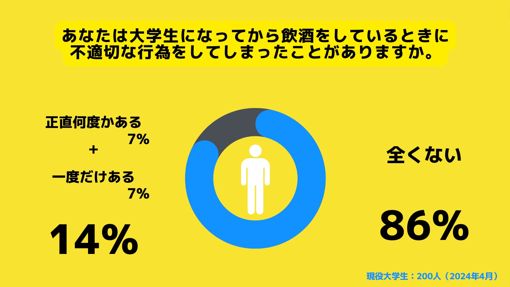 86%の大学生が飲酒をしているときに不適切な行為をしたことは全くないと回答しました。