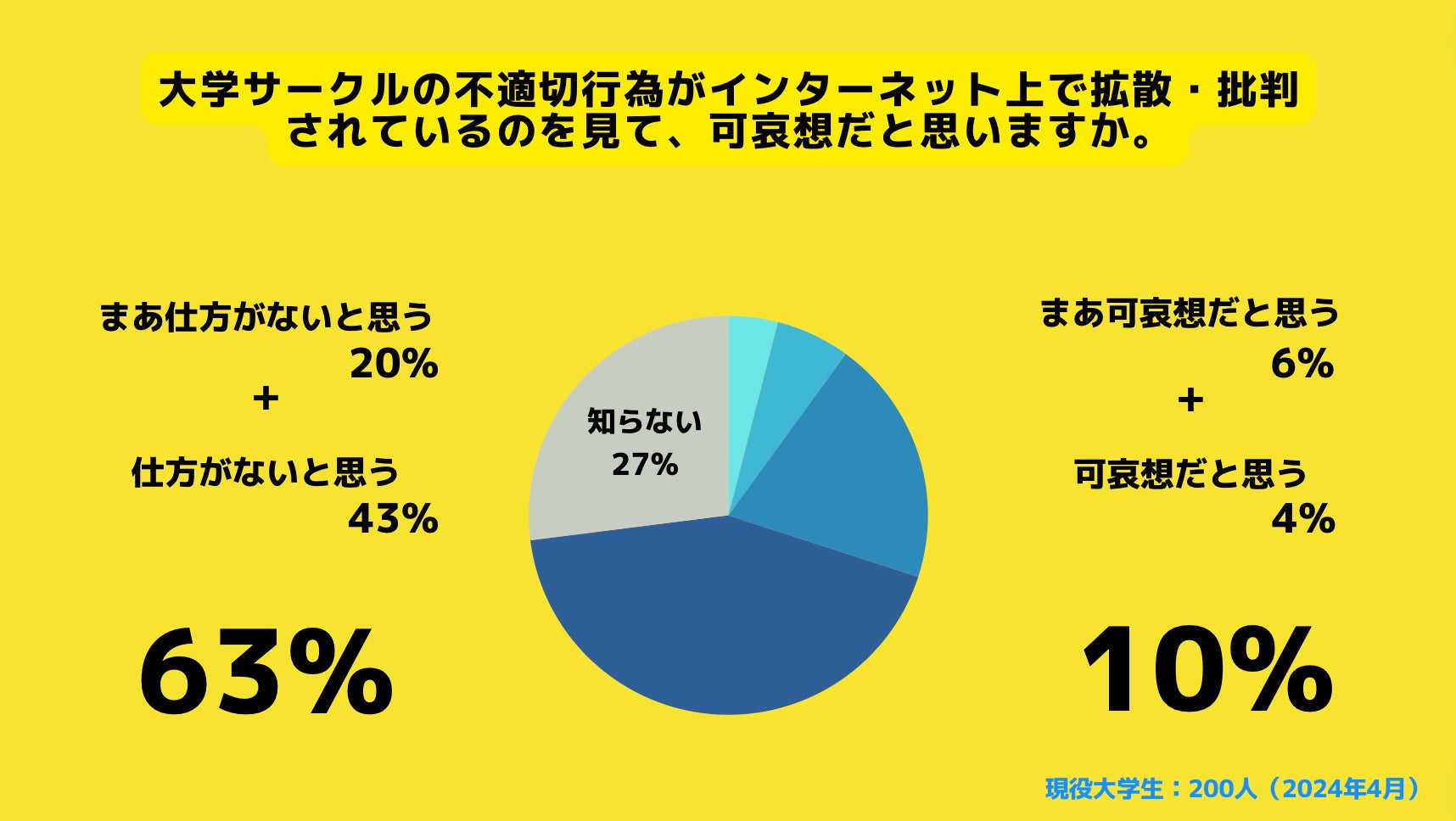 大学サークルの不適切行為の不適切行為に対するネット上での批判を受けて可哀想だと思うか質問したところ、63%の大学生が「仕方がないと思う」と回答しました。