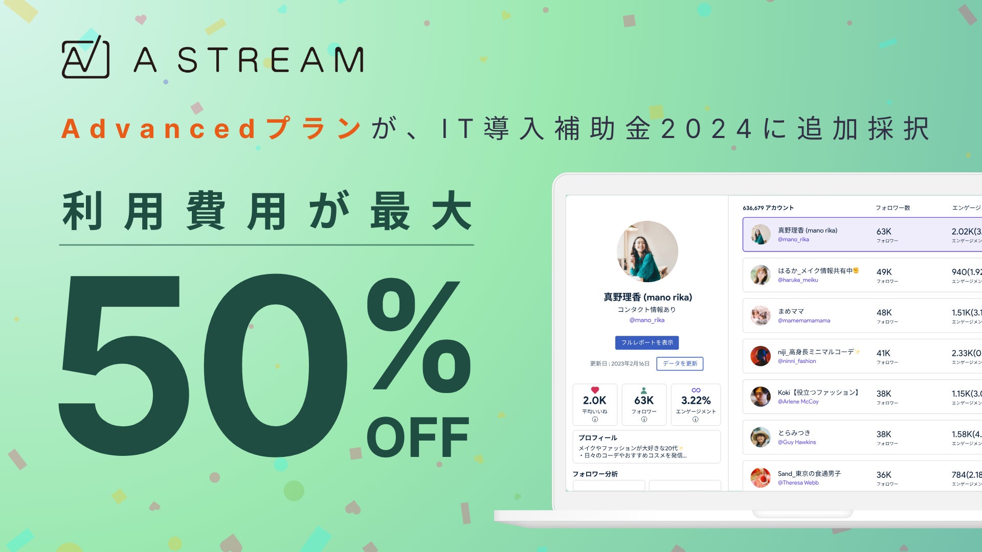 インフルエンサーマーケティングツール「Astream(エーストリーム)」を提供する株式会社A(読み:エース、代表取締役CEO 中嶋泰)は、経済産業省が推進するサービス等生産性向上IT導入支援事業「IT導入補助金2024」において、IT導入支援事業者に継続採択されました。