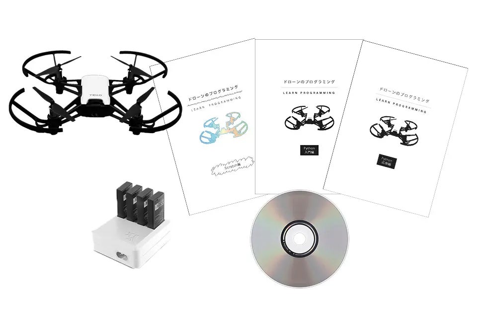 ドローンとドローン飛行のサンプルプログラム、テキスト 等で構成されます。