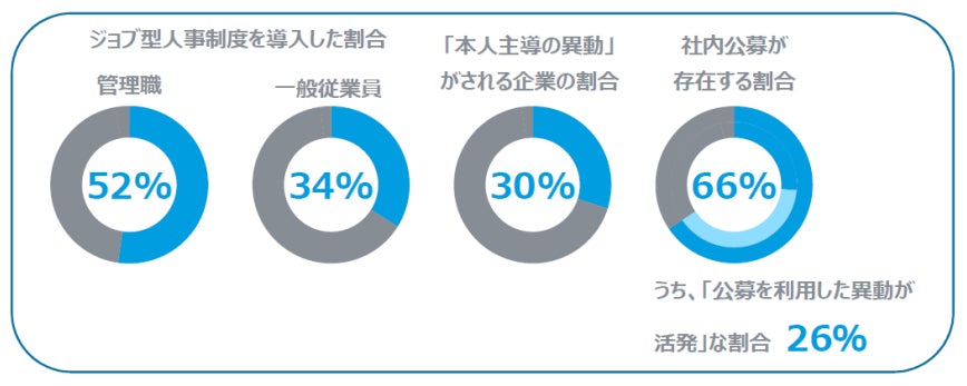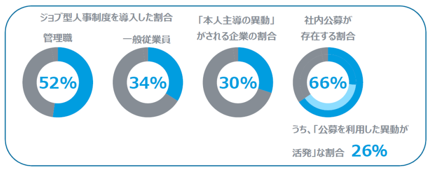 管理職の人事制度が「ジョブ型」・「どちらかというとジョブ型」・「ジョブ型とメンバーシップ型のミックス」という企業は、全体の52%となる一方、一般従業員では34%にとどまる。また、「本人主導の異動(会社主導だが本人の同意をとる または 会社と本人の同意をとる)」が行われている企業は30%にとどまる。社内公募制度は回答企業中の66%で導入されているが、「公募を利用した異動が活発に行われている」企業の割合は26%となっている。全体的に様々な制度導入が進む一方で、個人のキャリア自律の本格的実現は、多くの企業でいまだ十分ではない様子が見受けられる。