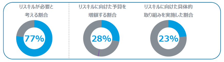 リスキリングが必要と考える企業は77%にのぼる一方で、従業員のリスキルに向けた予算を増額する企業は全体の28%、研修・再配置などの具体的施策を実行した企業は23%にとどまる。リスキルの必要性を認識しつつも、多くの企業で具体的な取り組みは今後の課題である様子がうかがえる。