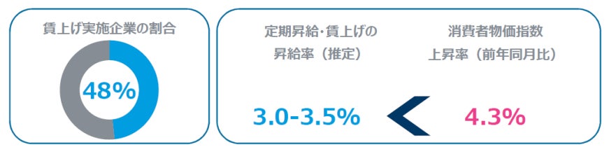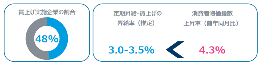 向こう1年間で賃上げ(ベースアップ、賃金テーブルの見直し、通常の定期昇給以上の昇給)を検討している企業は、回答企業の約5割にのぼる。一方、定期昇給を含めた賃上げの平均値は3.0-3.5%程度と推定され、消費者物価指数の前年同月比上昇率(4.3%)*に比べて劣後する。