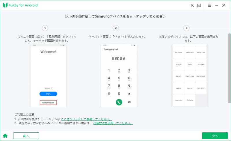 ステップ3: ガイド画面に従ってテストモードに入りましたら、「次へ」ボタンをクリックします。 デバイスから FRP ロックの削除を開始します。