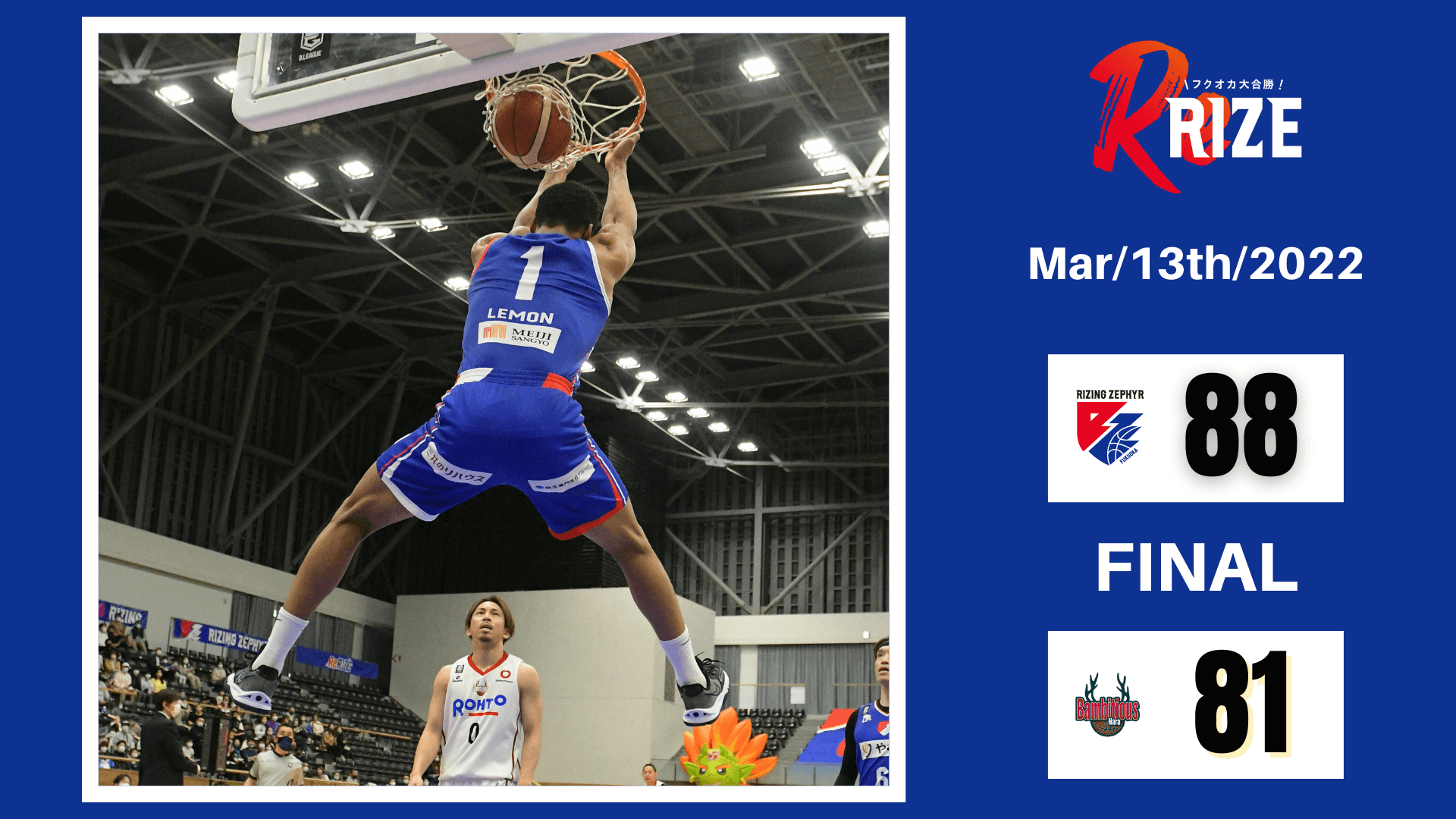 2022年3月13日(日)に開催されましたBリーグ第25節【ライジングゼファーフクオカvs.バンビシャス奈良】において“福岡88-81奈良”の結果となりましたことお知らせいたします。