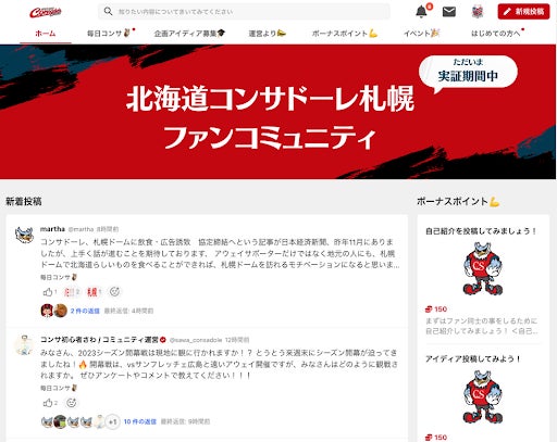 | 実証内容:北海道コンサドーレ札幌のサポーターが主体的に発信できるコミュニティをつくり、チーム及び地域が活性化するアイデアを生み出します。 ①投稿テーマ: 1.札幌ドームを中心に街の賑わいを作る 2.コンサドーレのファンを増やす 3.ファンの力でもっと選手を応援する ②特典 ログイン、投稿、コメント、いいね、その他"ボーナス"タブで紹介されているタスクを完了すると、独自ポイントを付与します。 付与ポイント: ダイヤモンド(優秀アイデア上位3名):選手サイン入りのユニフォーム(レプリカ) ゴールド(1,500pt):クラブ運営からの感謝1分動画 シルバー(500pt):感謝状(デジタル) ブロンズ(300pt):コミュニティ会員証(デジタル) ③優秀アイデアについて 本実証期間に寄せられたアイデアは今後のクラブ独自の取り組みや自治体との協働の取り組みの参考とさせていただきます。 実証期間:2023年1月26日(木)~3月7日(火) ※対象者を限定し、クローズドで実証中。 |