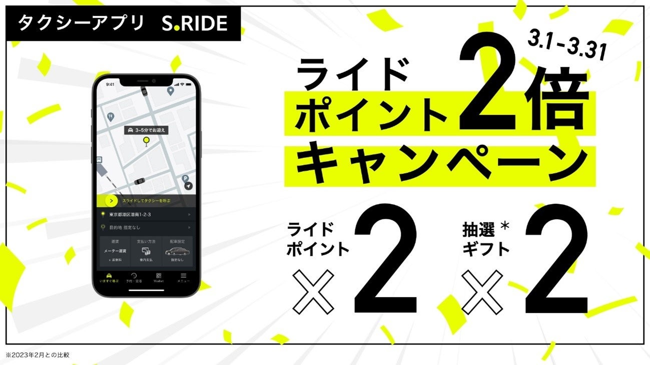 キャンペーン期間中、S.RIDEでの配車で乗車いただくことで通常の2倍の2ライドポイントを付与いたします。また、S.RIDEプレミアム会員は4倍の4ライドポイント、S.RIDE WALLETのご利用で2倍の2ライドポイントを付与いたします。
