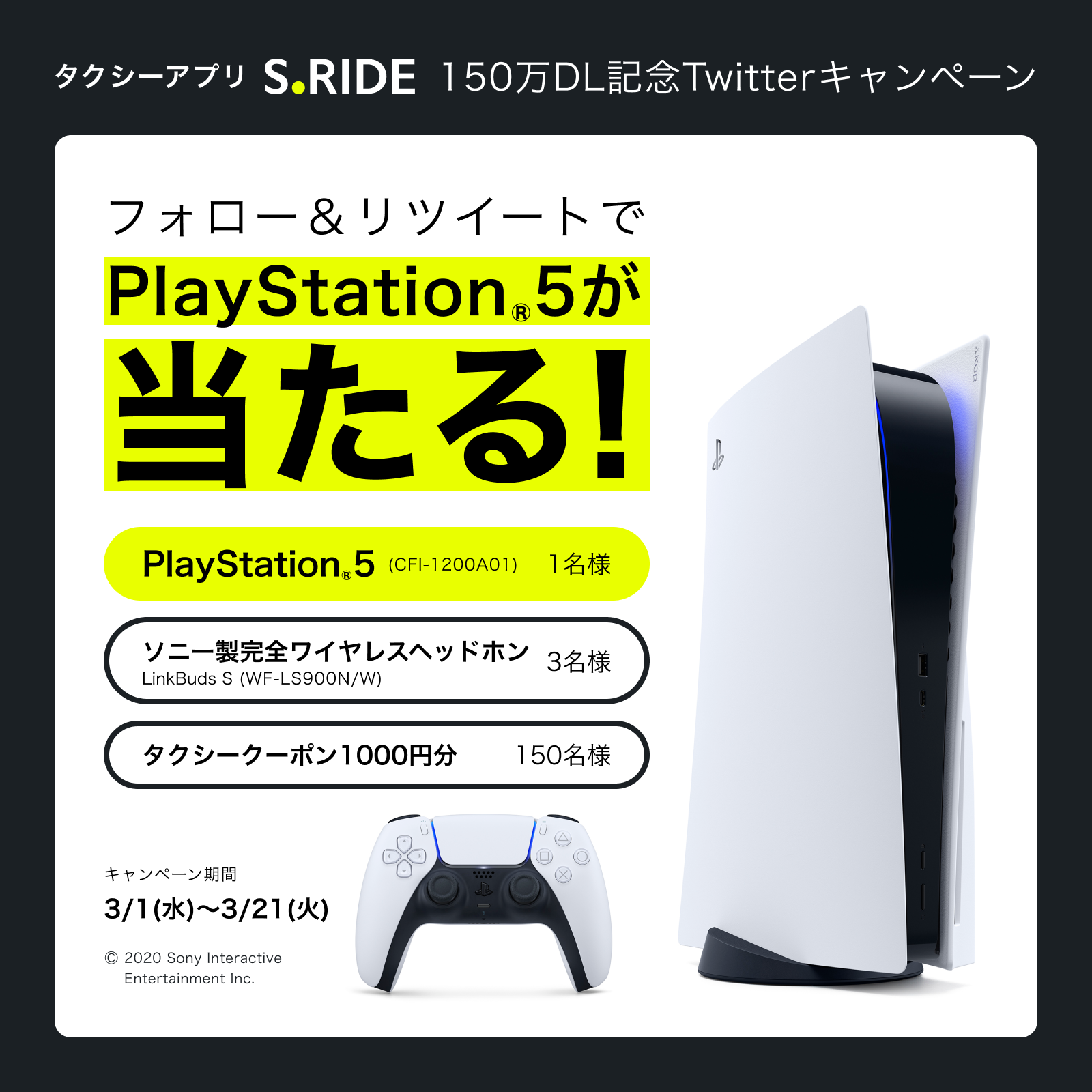 150万ダウンロードを記念し、抽選でPlayStation®5や ソニー製完全ワイヤレスヘッドホン LinkBuds Sなどの景品があたるTwitterキャンペーンや期間中のタクシー乗車で貰えるライドポイントが2倍になるキャンペーンを実施いたします。
