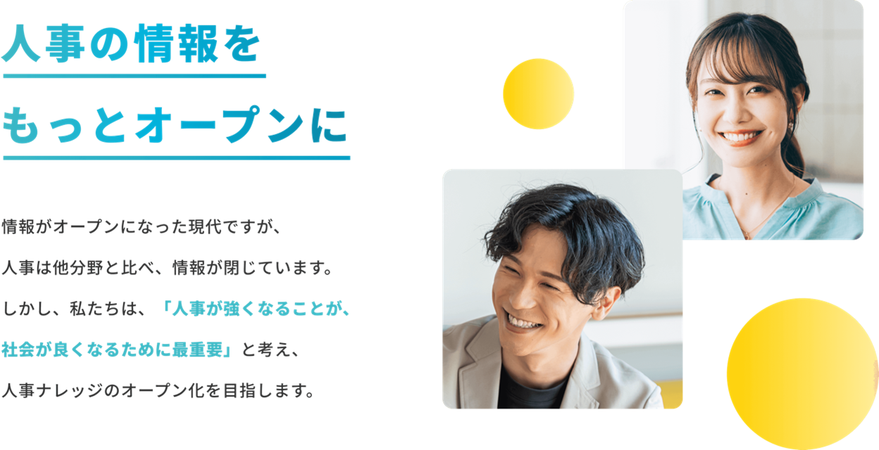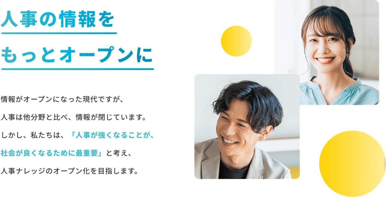 人事の仕事には正解がないため、教科書的な学びよりも、状況に合わせて最適解を試行していった、実践家のケースから学ぶことが重要になってきます。そのため、当サービスでは、「人事の情報をよりオープンにし、人事業界が強くなることが、社会が良くなるために最重要」と考え、人事ナレッジのオープン化を目指しています。