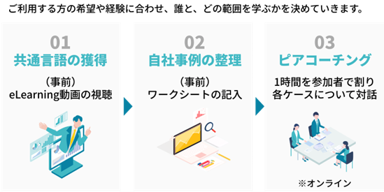 コンサルタント進行の下、他社人事と少人数(1対1~3人)で、毎月1時間、オンラインで集まり、各社のケースについてお互いに議論・対話をしながら学ぶサービスです。