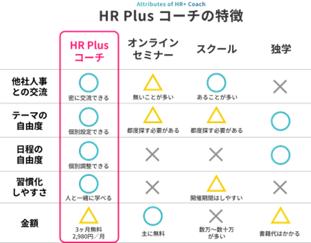 HR Plusの特徴は、「他社人事との交流が出来る」、「テーマの自由度が高く、欲しい情報を得られる」、「日程調整が個別相談できる」、「人と一緒に学べるので習慣化しやすい」という点があります。