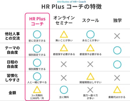 人事の学びはこれまで、「セミナー」「スクール」「独学(本や記事など)」が主流でした。しかし、これらの形式ではそれぞれに、「日程調整しにくい」「テーマの自由度が低い(欲しい情報が得られない)」「事例から学べない(なんとなく理想論に見える)」といったデメリットがありました。そこで、当サービスでは、時間もテーマも個別最適に、他社交流を通して「事例」も学べる、人事業界初※の、ピアコーチ形式での学習サービスである「HR+ピアコーチ」を始めました。