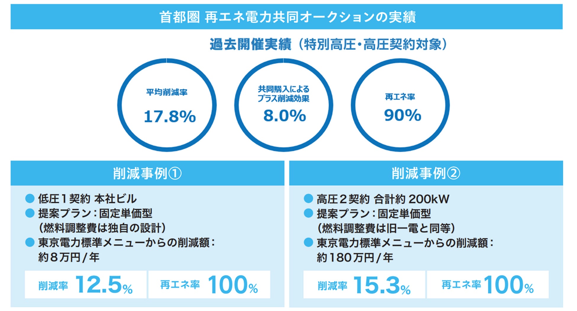 過去の再エネ共同オークションでは、地域の旧一般電気事業者の標準メニューに比べて安価な金額で再エネの電力メニューへの切替実績がございます。
