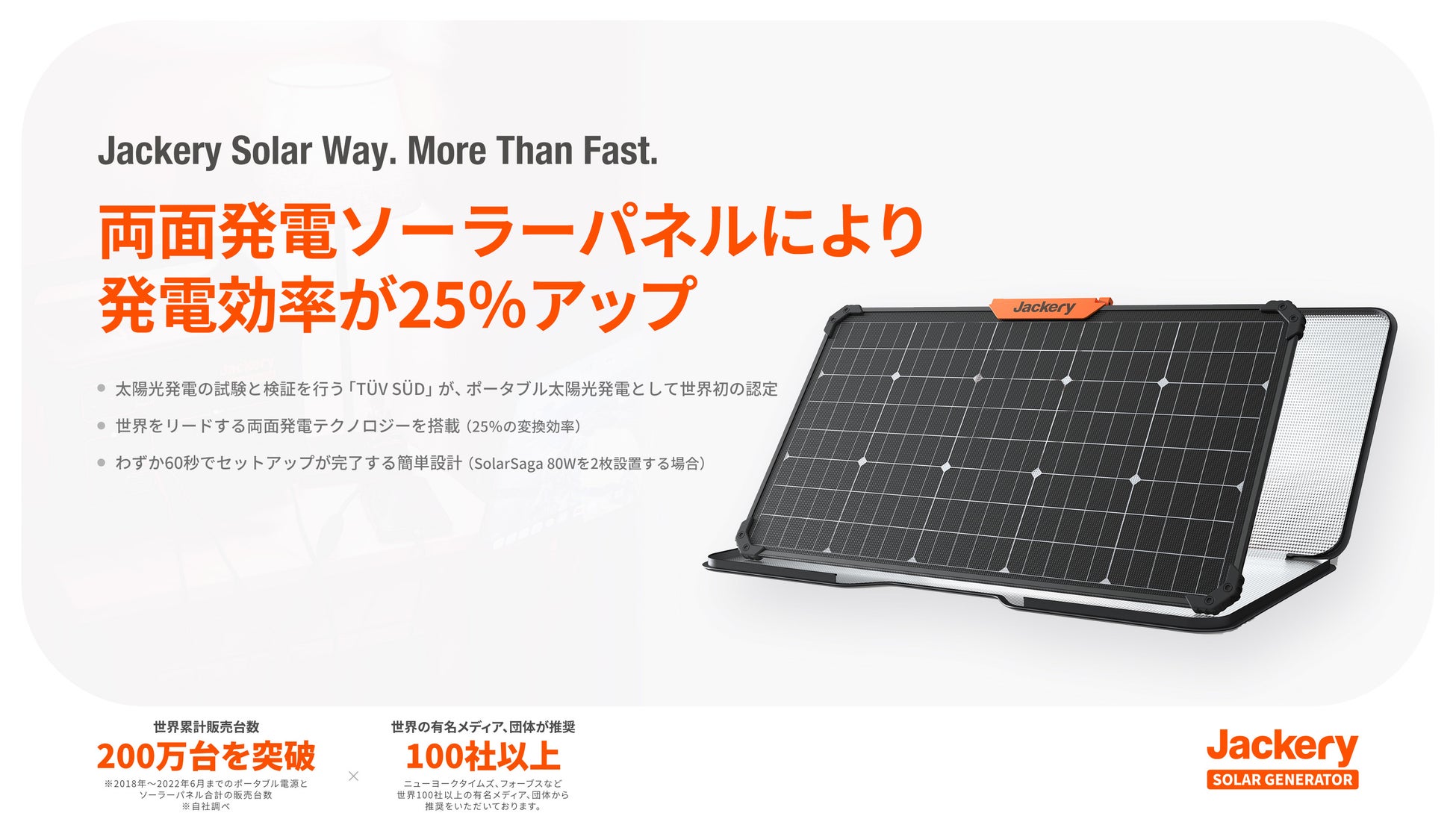 また、先進技術である両面ソーラー発電を実現した「Jackery SolarSaga 80」も同日発売します。前面のソーラーパネルが太陽光を使って発電すると同時に、地上からの反射光と拡散光を背面からも吸収することで、太陽光発電の変換効率を25%アップしました。