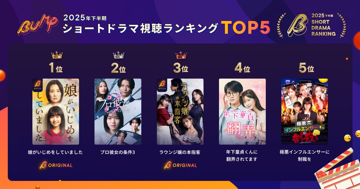 ショートドラマアプリ「BUMP」を開発・運営するemole株式会社(本社:東京都目黒区、代表取締役:澤村直道、以下、emole)は、「BUMP」における2025年下半期(2025年7月1日〜12月31日)のショートドラマ視聴ランキング・トップ5を発表しました。視聴数第1位には、『娘がいじめをしていました』が選ばれています。