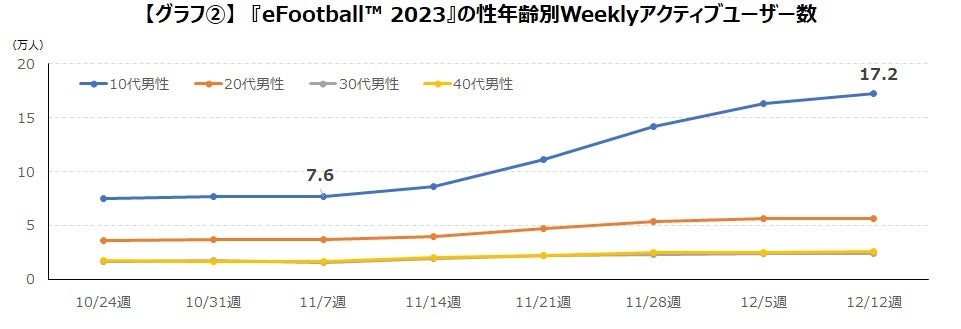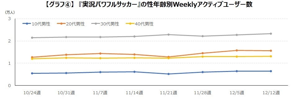 ユーザー数の推移を見ると、ワールドカップが開催された11月14日週から、ユーザー数が増加していますが、その増加率は比較的緩やかなものとなっています。ユーザー数の増加が目立つのは40代と30代の男性で、『eFootball™ 2023』で増加が目立った10代男性の変化はほとんど見られませんでした。【グラフ③】