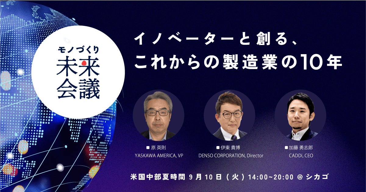当日は、DENSO CORPORATIONのDirector 伊東貴博氏、YASKAWA AMERICA, INC.のVice President 原英則氏、CADDi CEOの加藤勇志郎の登壇が決定し、当イベント冒頭では柳淳 在シカゴ総領事によるご挨拶もいただく予定です。 製造業界の第一線で活躍する在米日系企業の方々から、アメリカにおける製造業の最前線についてお話いただきます。登壇者は今後も随時追加予定です。