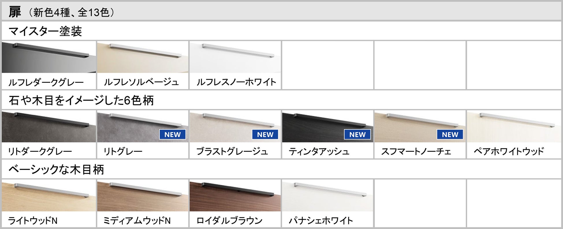 カウンター下の扉には、石や木目をイメージした色柄を新たに4色(リトグレー、ブラストグレージュ、ティンタアッシュ、スフマートノーチェ)を加え、全13色となります。