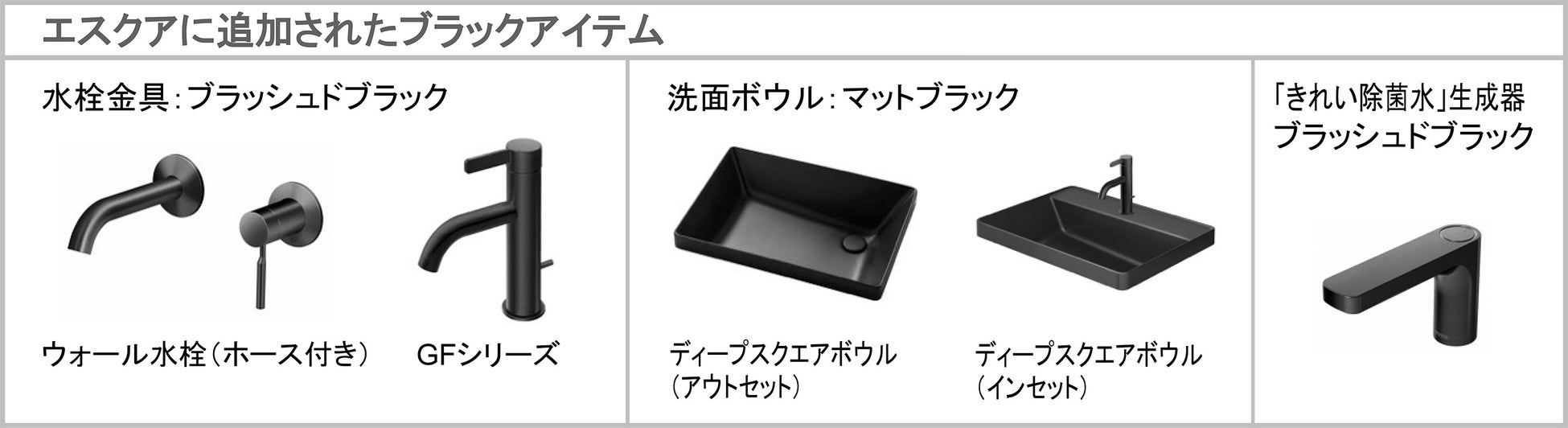 エスクアでは、水栓金具2種類(ウォール水栓、GFシリーズ)に「ブラッシュドブラック」、洗面ボウル2種類[ディープスクエアボウル(アウトセット)、ディープスクエアボウル(インセット)]に「マットブラック」、「きれい除菌水」生成器に「ブラッシュドブラック」を追加します。