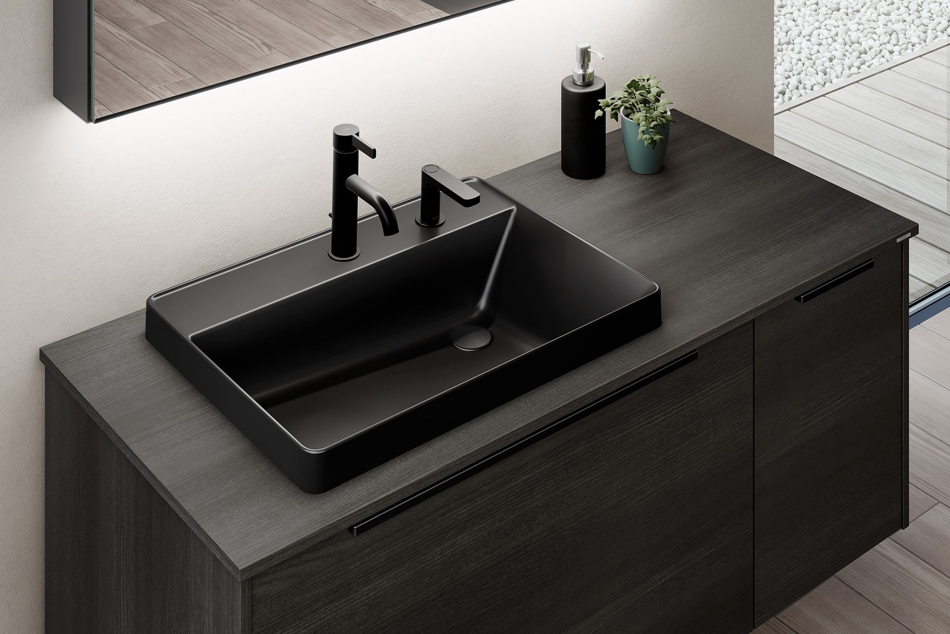 |洗面ボウル:ディープスクエアボウル(マットブラック)|「きれい除菌水」生成器(ブラッシュドブラック)|カウンター(ティンタアッシュ)|キャビネット(ティンタアッシュ)|鏡フレーム(ブラック)