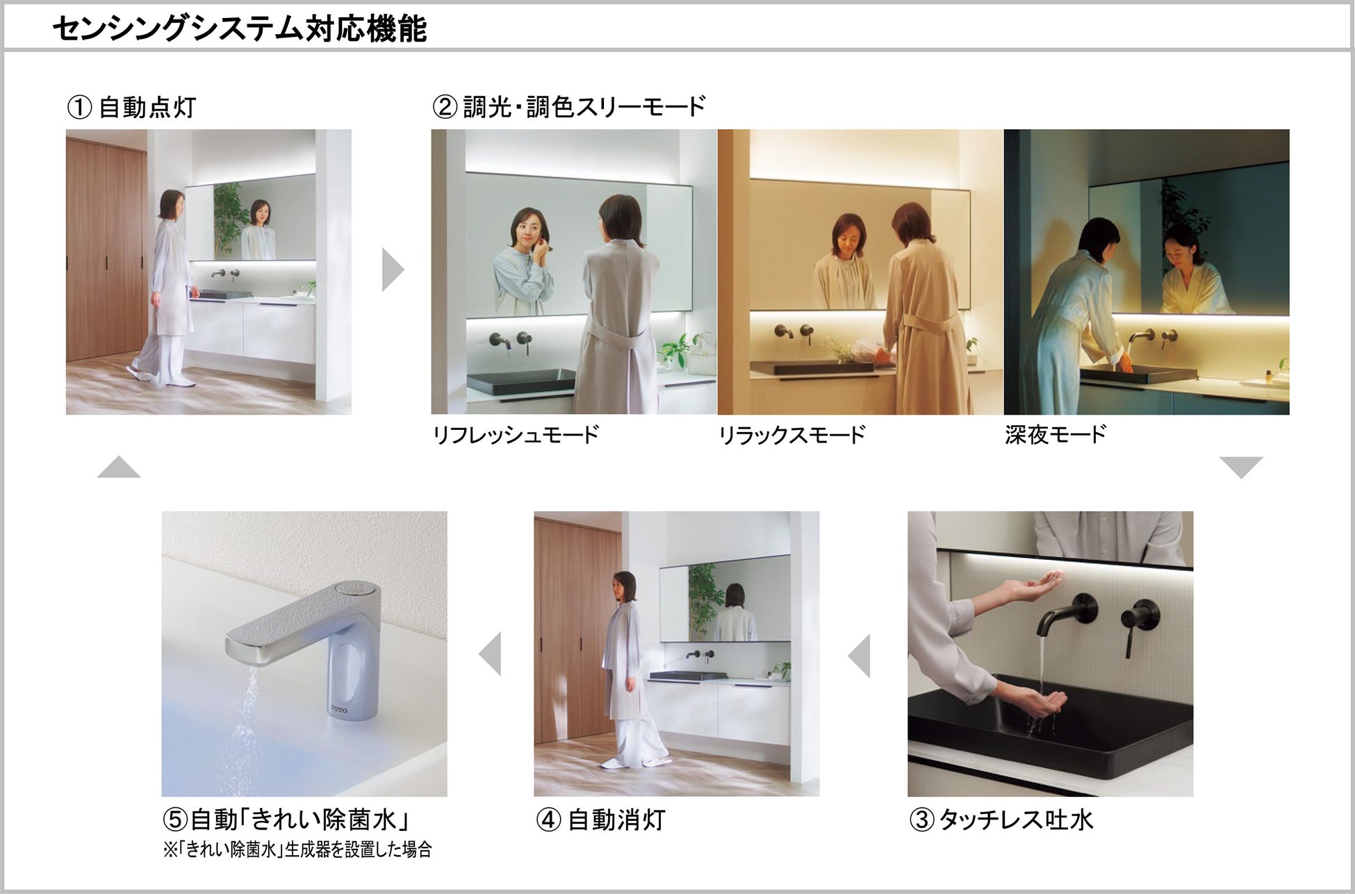 ・照明の自動点灯・消灯機能(+手かざしによるタッチレス照明)、調光調色スリーモード、「きれい除菌水」の自動噴霧