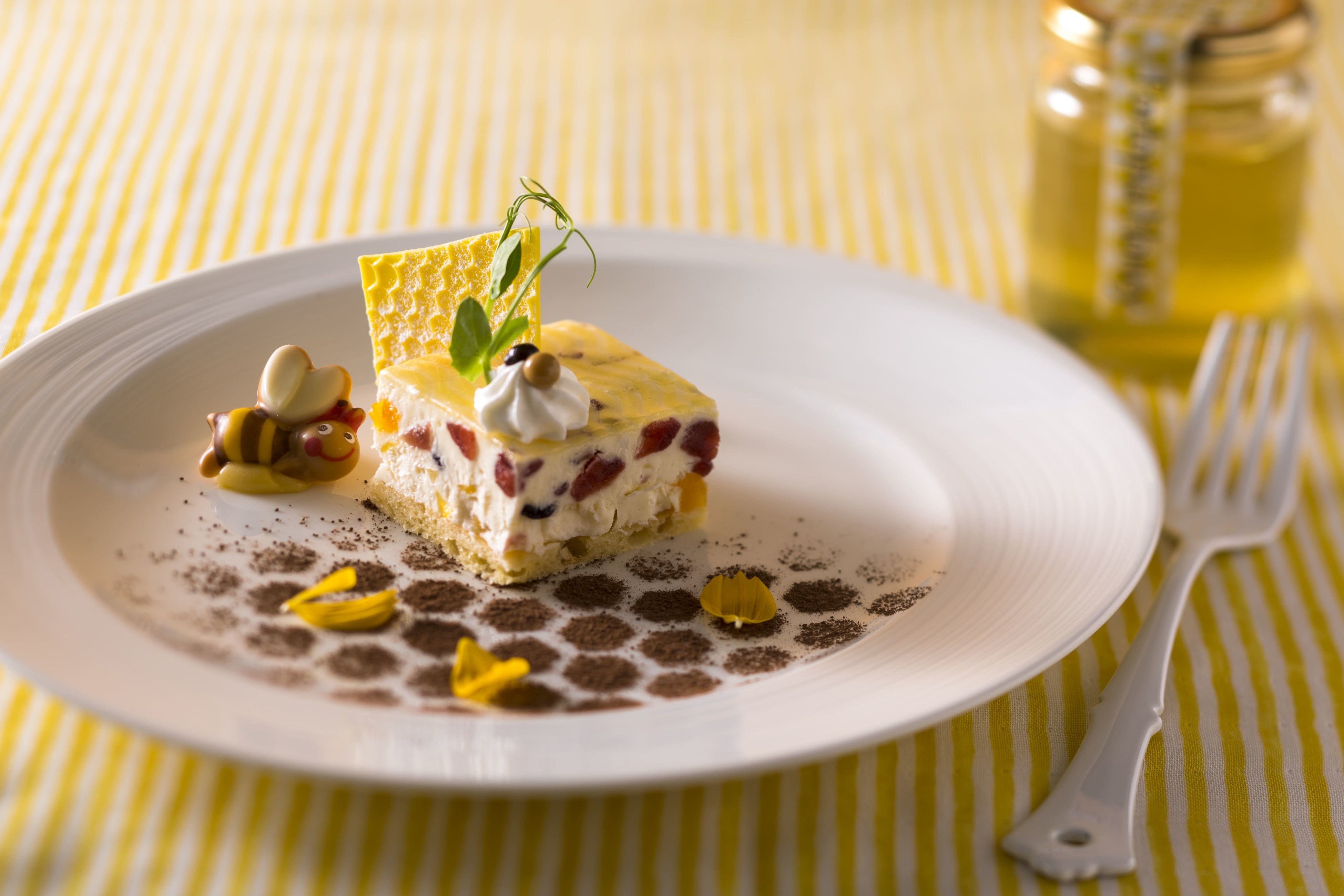 ポートピアハニーを使ったムースに、ヌガーとドライフルーツをミックス。はちの巣模様が描かれたプレートで、可愛らしいミツバチのチョコレートとともに皆さまをお迎えします。