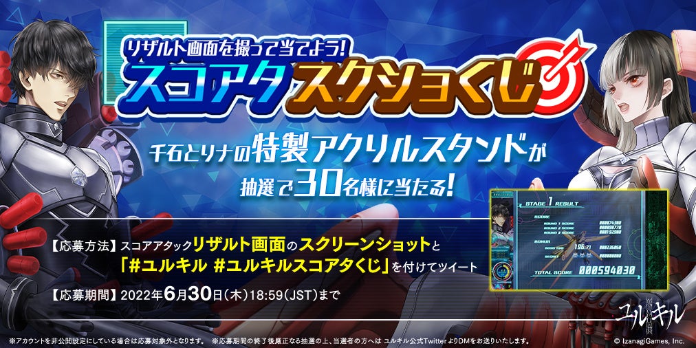 ユルキル発売記念イベント「スコアタスクショくじ」開催!スコアアタックのリザルト画面スクショ&#ユルキル #ユルキルスコアタくじ を付けてツイートして「千石とリナの特製アクリルスタンド」を当てよう!